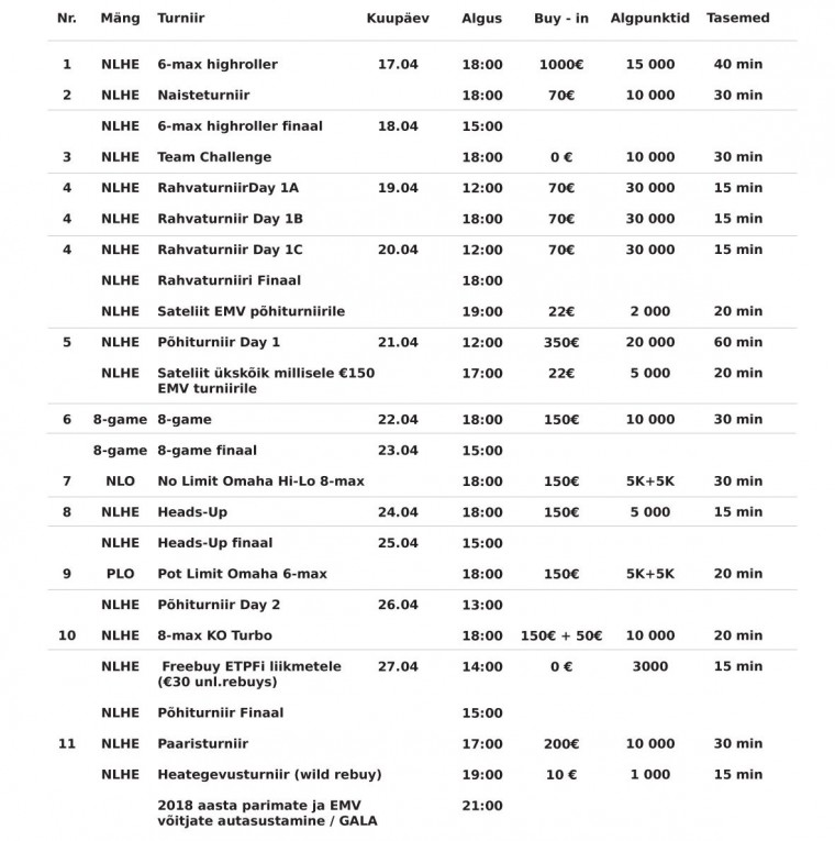 17.-27. aprillil korraldab Eesti Turniiripokkeri Föderatsioon (ETPF) selleaastased, arvult 16. Eesti meistrivõistlused pokkeris (EMV). Tallinnas, Olympic Park kasiinos läbiviidava festivali käigus jagatakse välja 11 meistritiitlit.