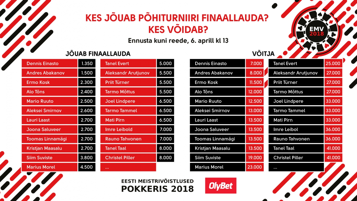 Turniir jätkub Hilton Tallinn Park hotellis ja Olympic Park Casinos sel laupäeval ning OlyBetis saab ennustada kuni reedeni, kes praeguseks võistlusele allesjäänud mängijatest pääseb üheksa edukama seas finaallauda ning kellest saab järgmine pokkeri Eesti meister.