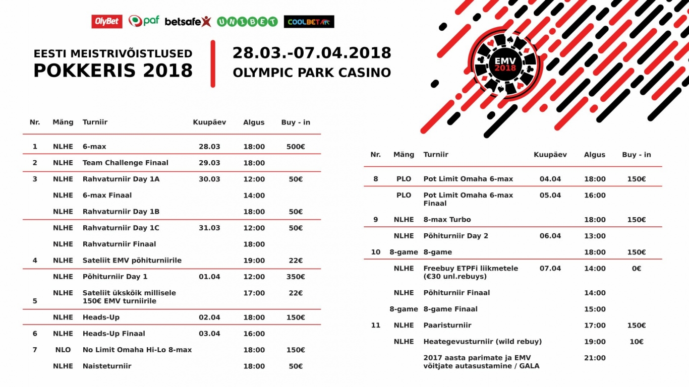 Tänavuste tiitlivõistluste tähtsaim, 350-eurose osalustasuga No Limit Holdem põhiturniir algab pühapäeval, 1. aprillil ning vältab kolm päeva. Meistrid selgitatakse ka 8-game’is ning populaarsetes No Limit Holdem Heads-Up, No Limit Holdem 8-max, Pot Limit Omaha 6-max ja No Limit Omaha High-Low 8-max mänguformaatides. Samuti on kavas naisteturniir ning paarismäng.
